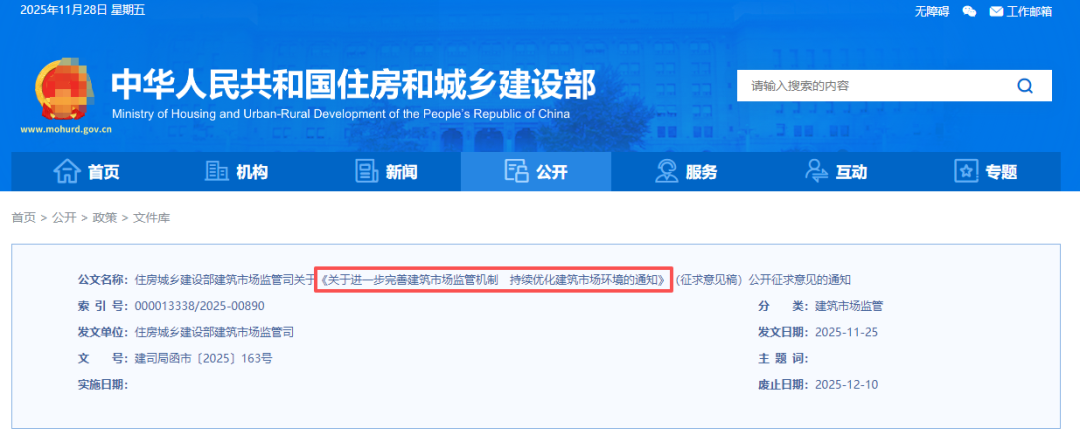 為貫徹落實《中共中央 國務院關于加快建設全國統(tǒng)一大市場的意見》精神,進一步夯實建筑市場經(jīng)營主體責任,強化建筑市場監(jiān)管,優(yōu)化建筑市場環(huán)境,加快構建“寬進、嚴管、重處”建筑市場監(jiān)管機制,我們研究起草了《關于進一步完善建筑市場監(jiān)管機制 持續(xù)優(yōu)化建筑市場環(huán)境的通知》(征求意見稿),現(xiàn)向社會公開征求意見。有關單位和個人可于2025年12月10日前,通過以下途徑和方式提出反饋意見。